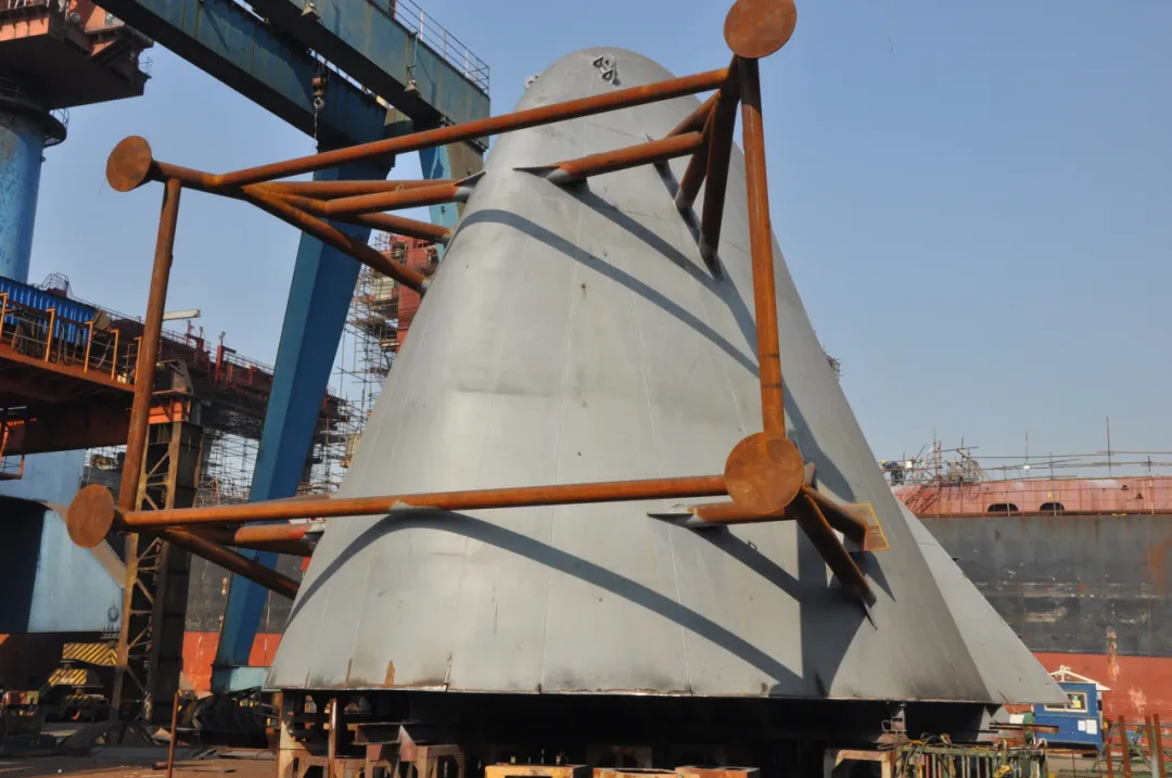 據(jù)了解,球鼻艏改裝主要有三個(gè)難點(diǎn):一是周期緊。待修理船舶往往存在無法提供原船完整性資料的問題,導(dǎo)致新舊結(jié)構(gòu)合攏精確度偏差大,增加船塢內(nèi)合攏修割時(shí)間。二是易變形。在球鼻艏改裝中,原船艏部保留有一段較長(zhǎng)的懸挑段,受重力影響容易產(chǎn)生下垂變形。三是安裝難。新球鼻艏一般有分段逐個(gè)搭載和總段整體安裝兩種方式,前者需要大量的輔助腳手平臺(tái)和牽引設(shè)備,而且要按序搭載;后者由于分段已經(jīng)預(yù)先組成總段,可實(shí)現(xiàn)一次性安裝,但受重量和尺寸限制無法使用常規(guī)吊裝方式進(jìn)行定位安裝。