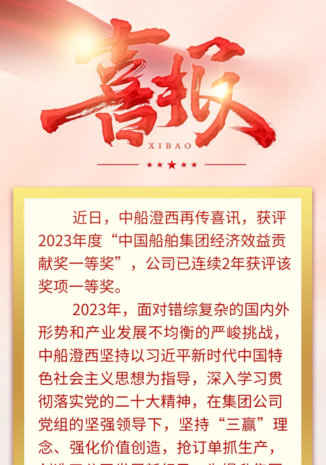 再傳喜訊!中船澄西再獲“中國船舶集團經(jīng)濟效益貢獻獎一等獎”